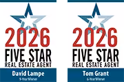 We're Five Star Award WinnersDavid Lampe and Tom Grant have each earned Five Star Real Estate Agent Awards for multiple years. The Five Star award recognizes service professionals who provide quality services to their clients. Five Star Professional conducts market research to define and promote professional excellence. The Five Star designation assists consumers in selecting a service professional that other consumers say provides exceptional client satisfaction and service.